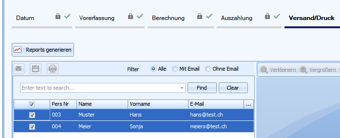 Nach dem Kontrollieren der Reports im unteren Bereich, können diese per Mail verschickt, als einzelne PDF gespeichert oder ausgedruckt werden.