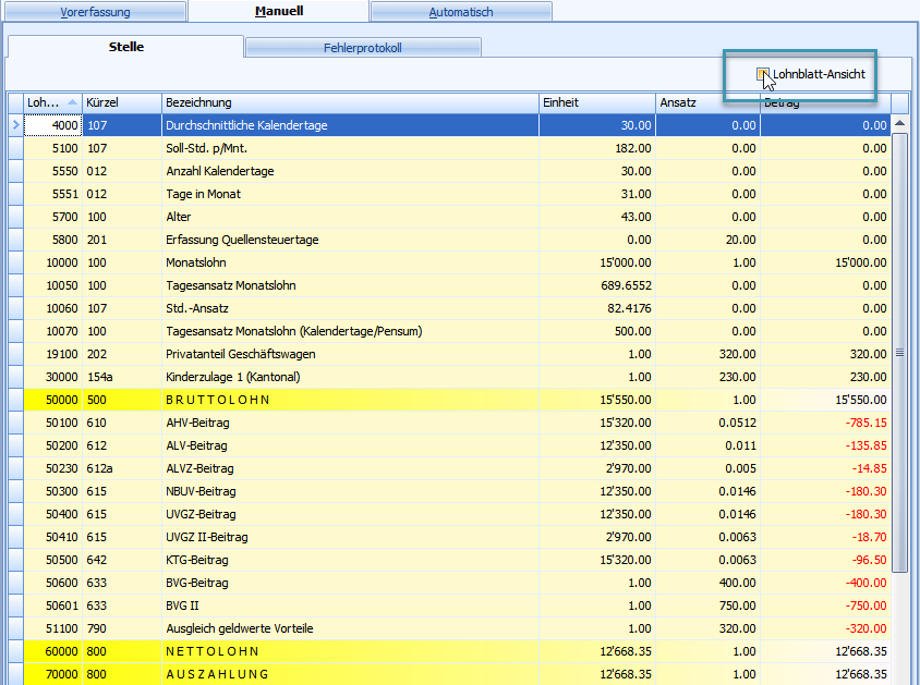 Die Kontrolle der Berechnungen erfolgt entweder über das Register Manuell, wo sämtliche berechneten Lohnarten eines Mitarbeiters sichtbar sind, oder über die entsprechenden Listen (Lohnblatt, Rekap usw.). Im Register Manuell besteht zudem die Möglichkeit die Lohnblatt-Ansicht einzuschalten, welche nur Lohnarten zeigt, welche auch auf dem Lohnblatt erscheinen.