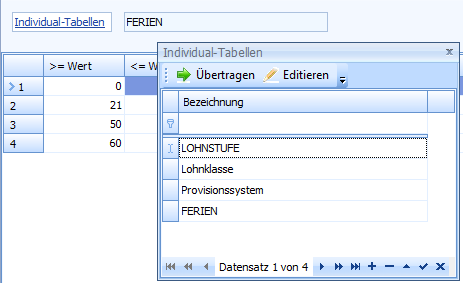 Definition von dynamischen Tabellen (beispielsweise Ferienzuschlag nach Alter). Diese Werte können anschliessend für die Berechnung von kundenspezifischen Lohnarten verwendet werden.