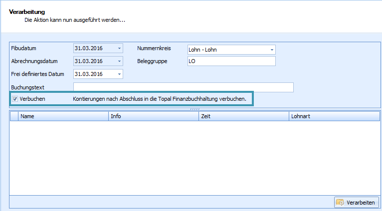 Kontieren des Lohnlaufs. Im letzten Schritt kann der Kontierungslauf optional direkt in die Finanzbuchhaltung verbucht werden.