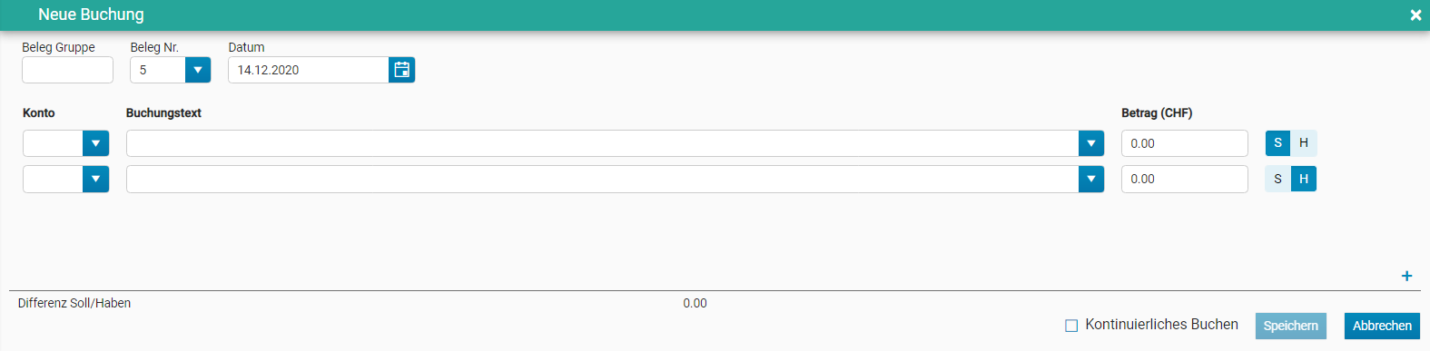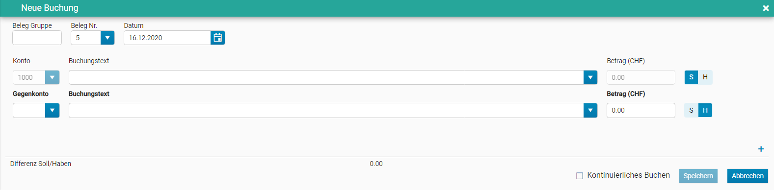 4. Geben Sie den Betrag ein und bestimmen Sie ob die Buchung auf der Soll oder Haben Seite getätigt werden soll. Der Betrag wird automatisch auf die nächste Buchungszeile übernommen.
