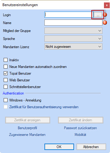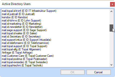 Topal erlaubt Ihnen Benutzer via Active Directory anzubinden. Um einen Benutzer aus dem Active Directory zu erstellen, ist der Button [...] (Abbildung 3) zu drücken. Dies öffnet die Auswahlliste der Benutzer Accounts die in Ihrem Active Directory verfügbar sind (Abbildung 4). Wählen Sie den gewünschten Benutzer aus und drücken Sie ok.