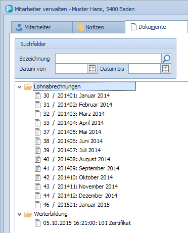 Auf die Registerkarte «Dokumente» haben alle Benutzer Zugriff, die mindestens Leseberechtigung auf der Hilfstabelle Mitarbeiter haben. Die Einträge der Lohnabrechnungen werden zwar angezeigt, können aber nur durch Benutzer eingesehen werden, welche Berechtigung für die Lohnbuchhaltung haben.