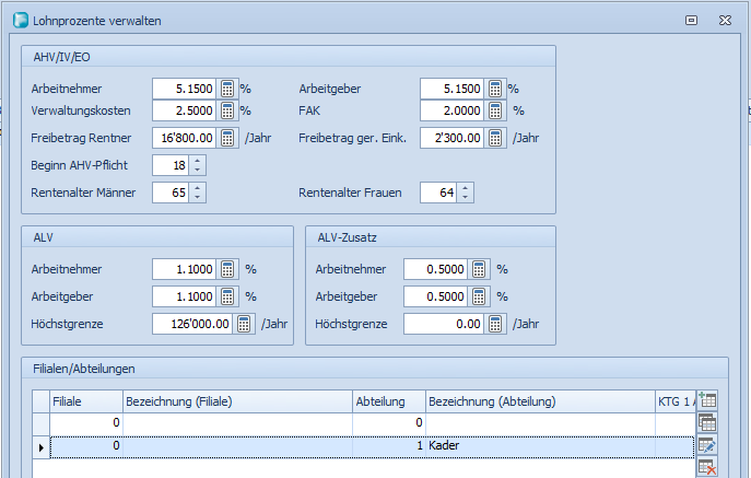 Das Fenster «Lohnprozente» wurde in der aktuellsten Version überarbeitet. Neu werden Angaben zur AHV/IV/EO sowie ALV zentral für die ganze Firma definiert. Pro Abteilung oder Filiale können alle übrigen Ansätze, Höchstgrenzen usw. einzeln definiert werden.