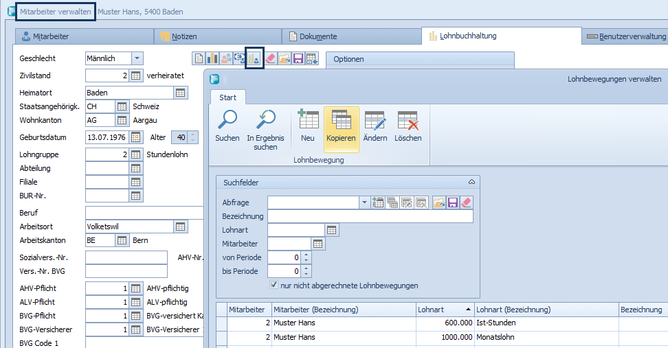 Lohnbewegungen auf Mitarbeiter Es wurde eine zusätzliche Schaltfläche hinzugefügt. Diese erlaubt den Zugriff auf die Lohnbewegungen direkt aus dem Mitarbeiter > Lohnbuchhaltung.