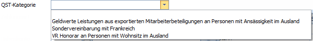 Ist die QST-Kategorie «VR Honorar an Personen mit Wohnsitz im Ausland» zu wählen, muss eine Lohnbewegung mit der Lohnart 5069.600 erfasst werden.