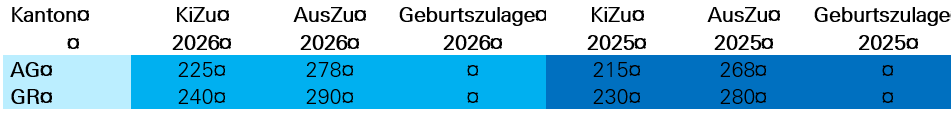 Die Kantone AG und GR haben die Kinder- und Ausbildungszulagen per 01.01.2026 jeweils um CHF 10.00 angehoben.