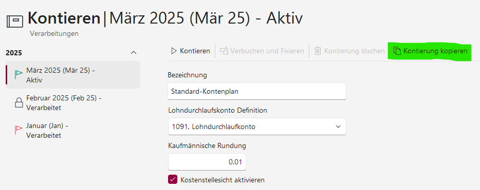 Erfolgt die Fibu-Kontierung erst zu einem späteren Zeitpunkt, kann man neu die Kontierung eines Lohnlaufes Kopieren und in einem nachfolgenden Lohnlauf einfügen.