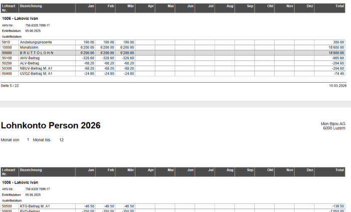 Neu wird auf jeder Seite beim Lohnkonto der Mandant sowie der Mitarbeiter angezeigt.