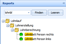 Oberhalb des Reportbaums steht neu ein Suchfeld zur Verfügung. Dieses schränkt die Ordner/Reports gemäss Suchkriterium ein: