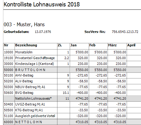 • Entspricht der Struktur des Lohnkontos und enthält zusätzlich die Lohnausweisziffer sowie eine Zwischensumme für den Nettolohn auf dem Lohnausweis