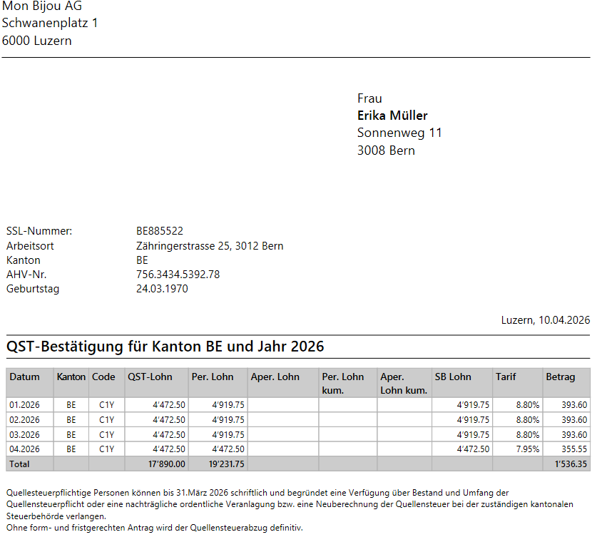 Neu steht die Auswertung «QST-Bestätigung» unter den Jahresauswertungen zur Verfügung. Diese wurde notwendig, da einzelne Kantone neu eine solche Bestätigung verlangen können. Unter Swissdec 4.0 genügte ein entsprechender Hinweis auf dem Lohnausweis.