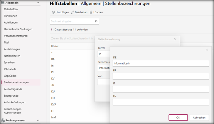 Damit diese Durchgängigkeit gegen ist, können neu auch alle Lohnarten, Benutzerfelder, Hilfstabellen etc. viersprachig erstellt werden.