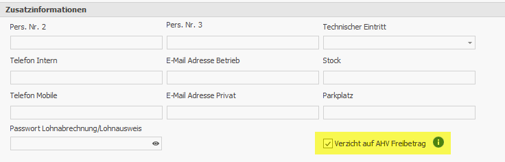 Dazu muss beim bei den betroffenen Mitarbeitern der Flag "Verzeicht auf AHV-Freibetrag" unter den Personalien aktiviert werden.