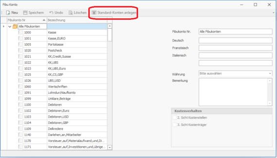 Fehlende Kontoplan-Vorlage Fehlt aus irgendwelchen Gründen bei einem Lohnmandanten der Kontoplan unter dem Menü "Rechnungswesen - Fibusicht" kann dieser über den neuen Befehl "Standard-Konten anlegen" entsprechend eingefügt werden.