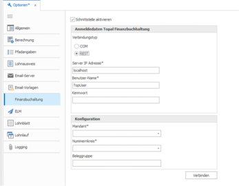 In den Optionen kann man neu die Verbindung zur Topal Finanzbuchhaltung ebenfalls über die REST-API-Schnittstelle anwählen.