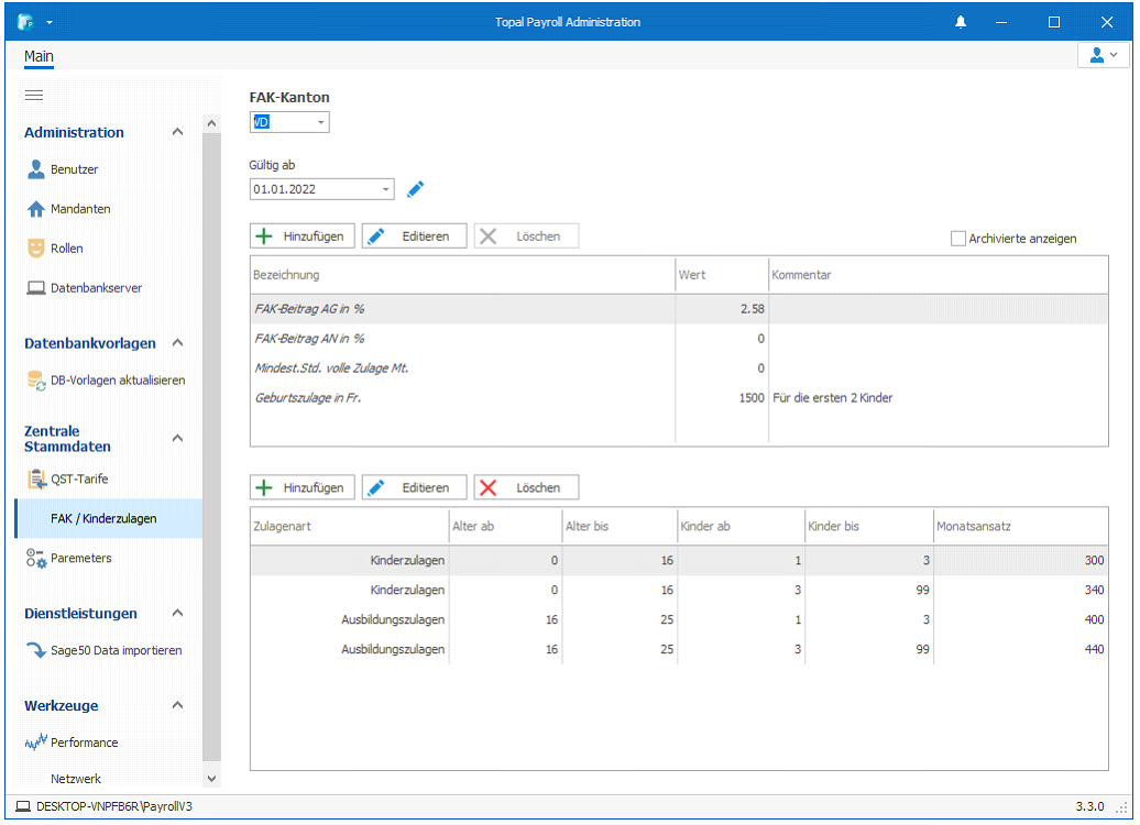 Die Kinder- und Ausbildungszulagen werden neu im Admin-UI verwaltet, da die entsprechenden Gesetzte für sämtliche Kantone in der Schweiz Ihre Gültigkeit haben. So müssen Sie künftig Anpassungen bei den Kinder- und Ausbildungszulagen nur noch zentral im Admin-UI und nicht mehr in jedem Mandanten anpassen.