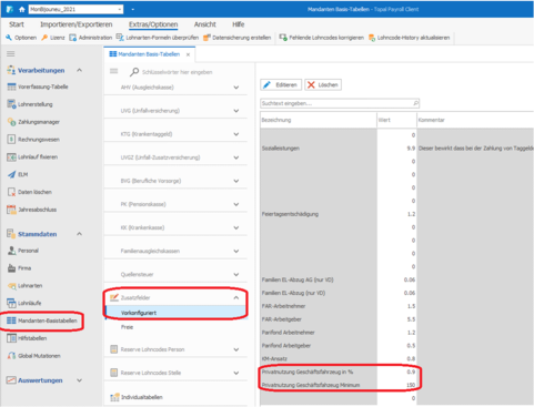 Mit der Version 3.3 haben wir die entsprechende Lohnart 19100 – Privatanteil Geschäftswagen entsprechend flexibel gestaltet, dass die neuen Werte per 01.01.2022 neu in den «Mandanten-Basistabellen» - «Zusatzfelder» - «Vorkonfiguriert» entsprechend angepasst werden können: