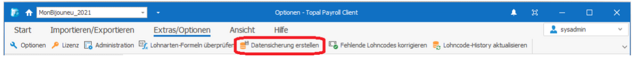 Neben dem automatischen Backup beim Abschliessen eines Lohnlaufs kann zukünftig auch ein User direkt aus dem Topal Payroll eine manuelle Datensicherung erstellen, ohne dabei ins AdminUI wechseln zu müssen. Den entsprechenden Button für die Datensicherung finden Sie unter dem Menü «Extras/Optionen»