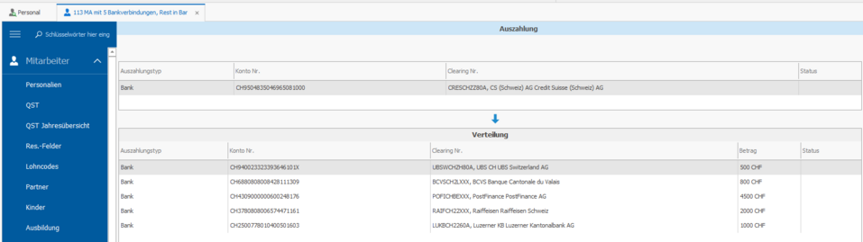 Die Darstellung des Menü "Auszahlung" wurde angepasst, damit es einfacher ist, bei einem Mitarbeiter mehrere Bankverbindungen zu hinterlegen und die Auszahlungen entsprechend aufzuteilen.