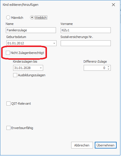 Der Flag "Nicht Zulagenberechtigt" steuert grundsätzlich ob für ein Kind Kinder- und Ausbildungszulagen berechnet werden. Oder ob kein gesetzlicher Anspruch auf die Kinder- und Ausbildungszulagen bestehen.