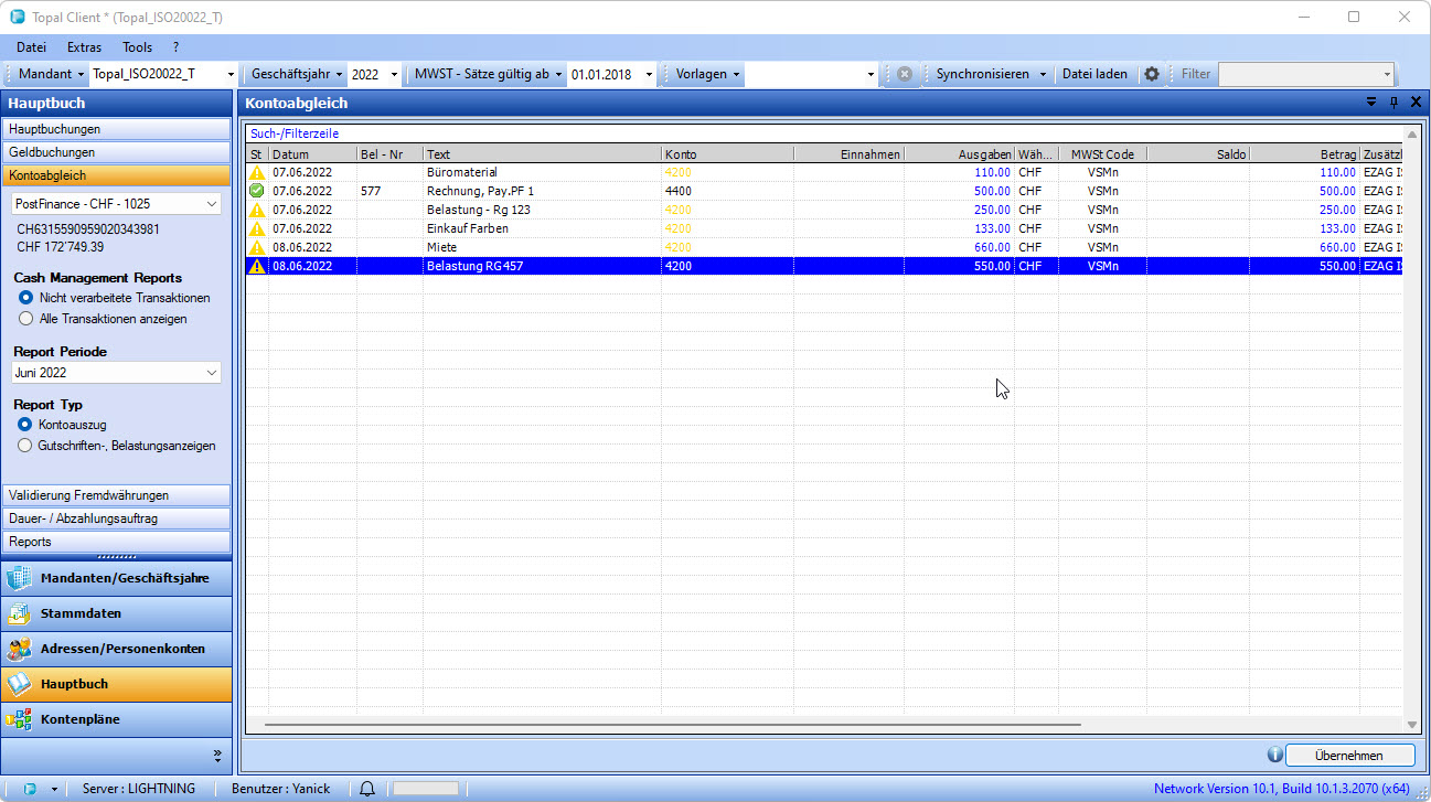 Hauptbuch Transaktionen zu erstellen. Detaillierte Angaben zu diesem Thema finden Sie im Topal Help unter [Hauptbuch | Kontoabgleich].