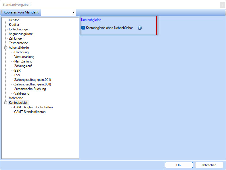 Einstellung Kontoabgleich mit/ohne Nebenbücher