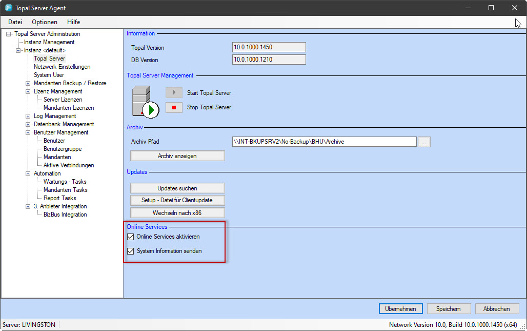 Um diese verwenden zu können, sind die Online Services zu aktivieren. Damit Topal den Support für Kunden optimaler gestalten kann wurde der Online Service System Informationen eingeführt.