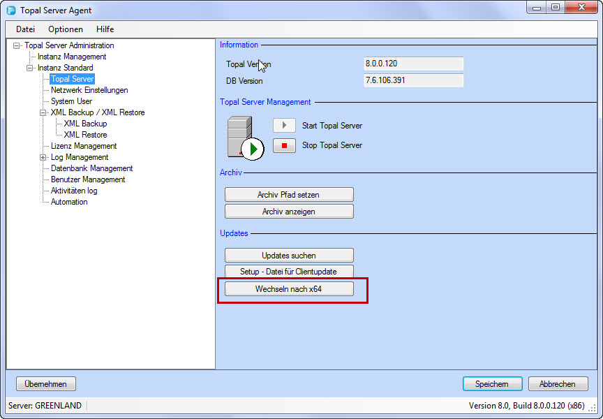 auch den Topal Server direkt umstellen. Nach der Umstellung auf x64 wird dieser Button als "Wechseln nach x86" ersichtlich sein.