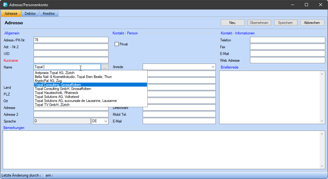 Der Adress - Dialog verfügt über eine Anbindung an den Zentral Firmenindex des Bundes. Wird eine Firma im Feld Name eingegeben, wird eine Anfrage im Firmenindex des Bundes
