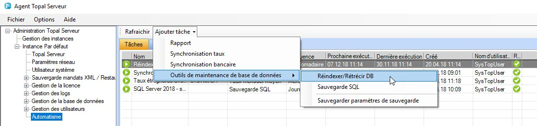Figure 1 : Automatisme - Tâche Réindexer/Rétrécir DB